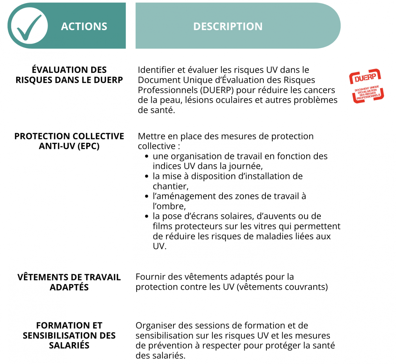 Quelles sont les mesures de prévention à mettre en place par l’employeur face aux dangers liés à l’exposition professionnelle aux UV solaires ?